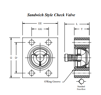 - 关键尺寸:O 形圈槽直径 2.44 英寸,端口间距 Q 为 4.19 英寸,安装厚度 EE 5.00 英寸,总长度 T 5.31 英寸,50 PSI 开启时整体长度 L 为 5.68 英寸。