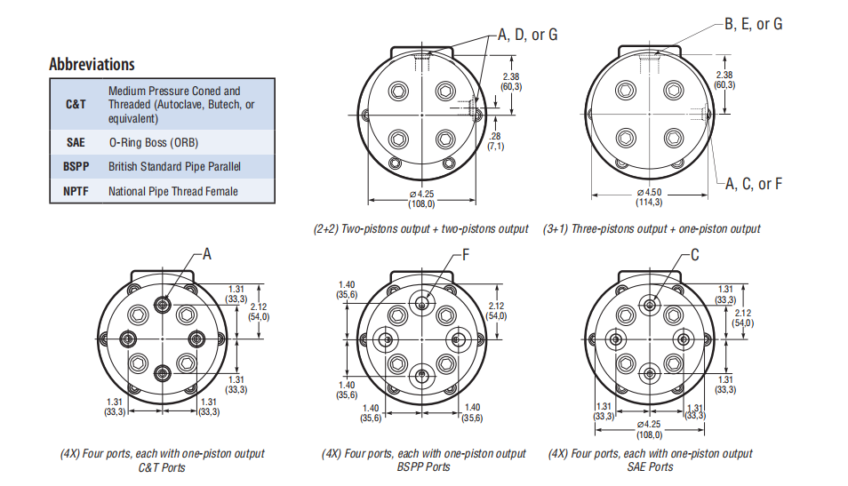 缩写 含义 C&T 中压锥螺纹(Autoclave、Butech 或等效类型) SAE O 形圈凸台(ORB) BSPP 英国标准平行管螺纹 NPTF 美国国家标准锥管螺纹(内螺纹) Split-Flow® 型号
