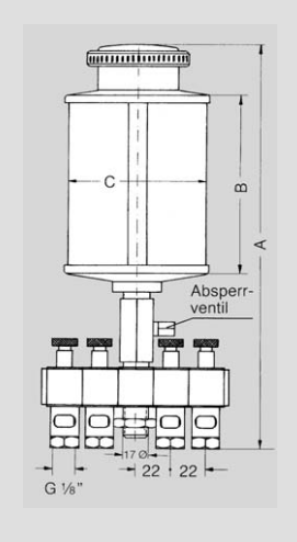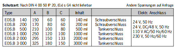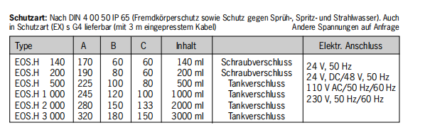 型号 A(mm) B(mm) C(mm) 容量 加注盖类型 电气连接 EOS.H 140 170 60 60 140 ml 螺纹盖 24 V,50 Hz EOS.H 200 190 80 60 200 ml 螺纹盖 24 V DC/48 V,50 Hz EOS.H 500 225 100 80 500 ml 油箱盖 110 V AC/50 Hz/60 Hz、230 V,50 Hz/60 Hz EOS.H 1000 245 120 100 1000 ml 油箱盖 同上 EOS.H 2000 280 150 133 2000 ml 油箱盖 未指定 EOS.H 3000 320 180 150 3000 ml 油箱盖 未指定 UNI 手动油分配器与多滴油润滑器技术说明