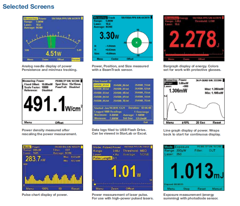 设备支持电池或交流电供电(充电器可兼作 AC 适配器),明亮的显示屏和用户可选的颜色格式适用于暗室环境或佩戴防护眼镜时使用。内置 USB 和 RS232 接口与 StarLab PC 软件配合,支持实时数据处理或历史数据调用,并在 PC 上图形化显示结果,同时提供 LabVIEW 驱动、COM 对象接口和演示源代码。屏幕布局与功能
