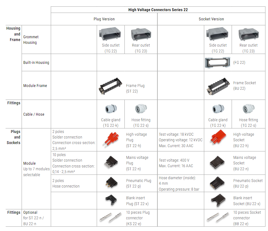 类别 插头版本 插座版本 外壳 框架和护线环外壳、后出口(TG 23)、侧出口(TG 22)、内置外壳(FG 22)、模块框架 框架和护线环外壳、后出口(TG 23)、侧出口(TG 22)、框架插座(BU 22)、框架插头(ST 22) 电缆 / 软管配件 电缆接头(TG 22-k)、软管接头(TG 22-s) 电缆接头(TG 22-k)、软管接头(TG 22-s) 2 极插头与插座(高压)