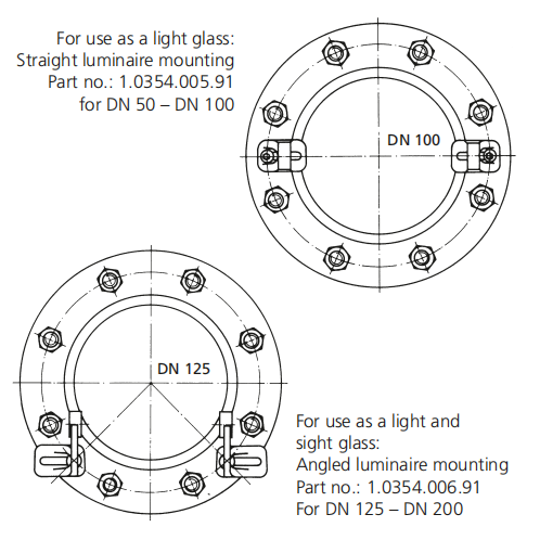 对于圆形视镜配件和目视流量指示器:灯具通过安装附件固定在盖法兰上。