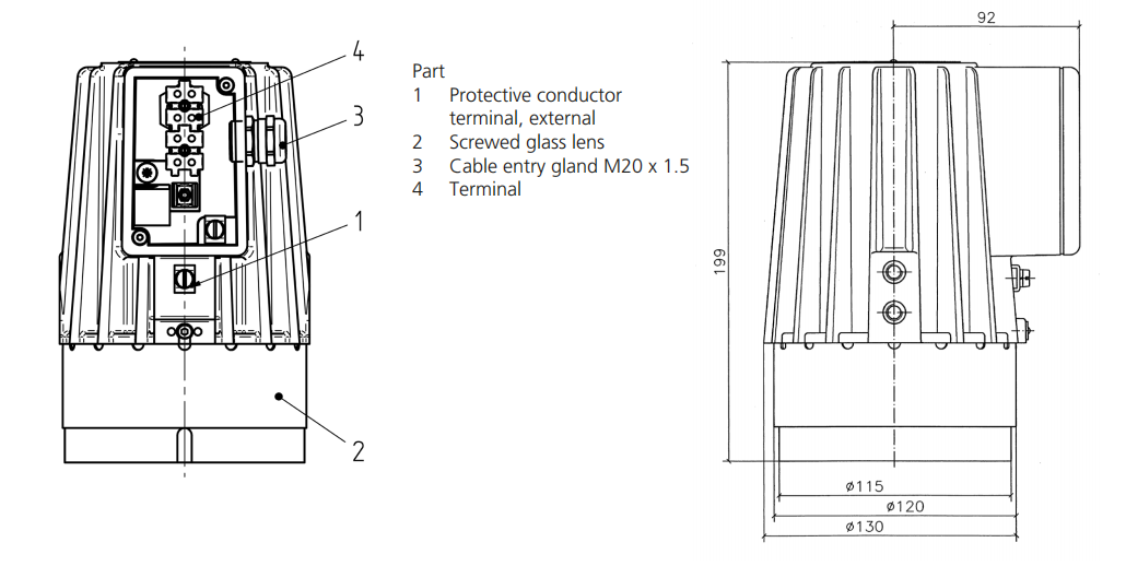 保护导体端子:灯具内腔已预接线,外壳外部设有额外保护导体端子